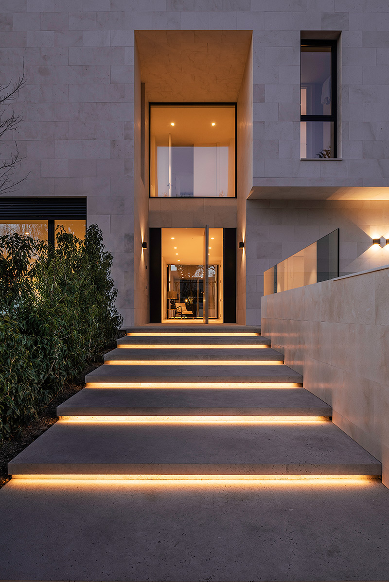 La planta principal se distribuye en dos ejes: el vertical une la entrada principal con el jardín, y el horizontal conecta la piscina con el salón y la escalera que conduce a la segunda planta, que se abre para permitir la conexión visual con el exterior a través de la fachada opuesta. Así, desde cualquier punto de la vivienda se ofrece la visión de los límites de la parcela.